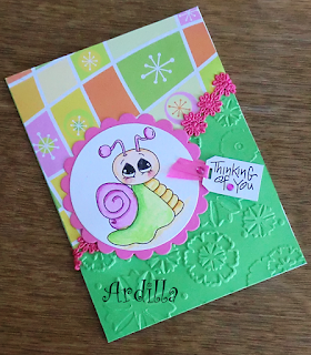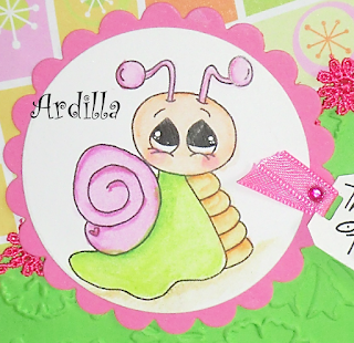 The image is Cute Snail and I colored it with Koh-i-noor aquarelable pencils. You can find many other cute images at Cre8tive Hands shop to play with. I cut it with a circle die and placed it on a pink cardstock mat cut with a scalop circle die.