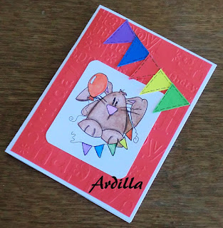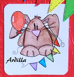The image is Rabbit with Balloon and I colored it with Koh-i-noor acuarelable pencils. I cut the corners of the image with a round punch.