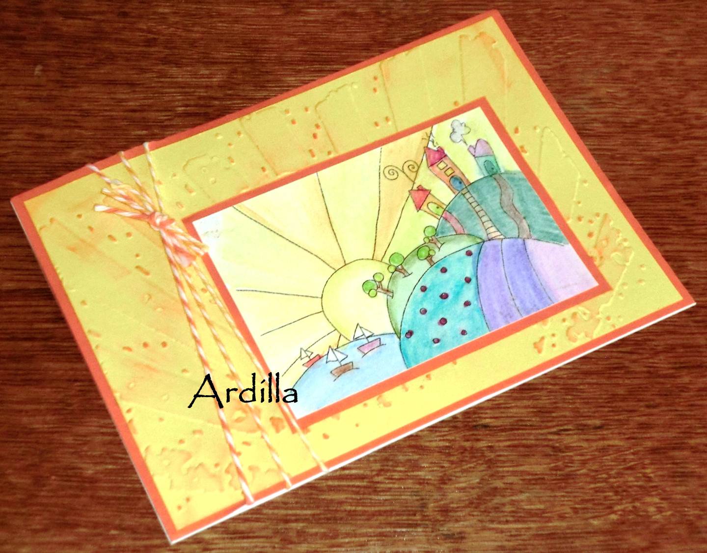 The image is a Naif landscape, a freebie at Cre8tive Hands blog (lots of freebies!!!). I colored it with Koh-i-noor acuarelable pencils. I try to use every color to give a very naif look and try to make a rainbow palette for the fields. I placed it on an orange cardstock mat.