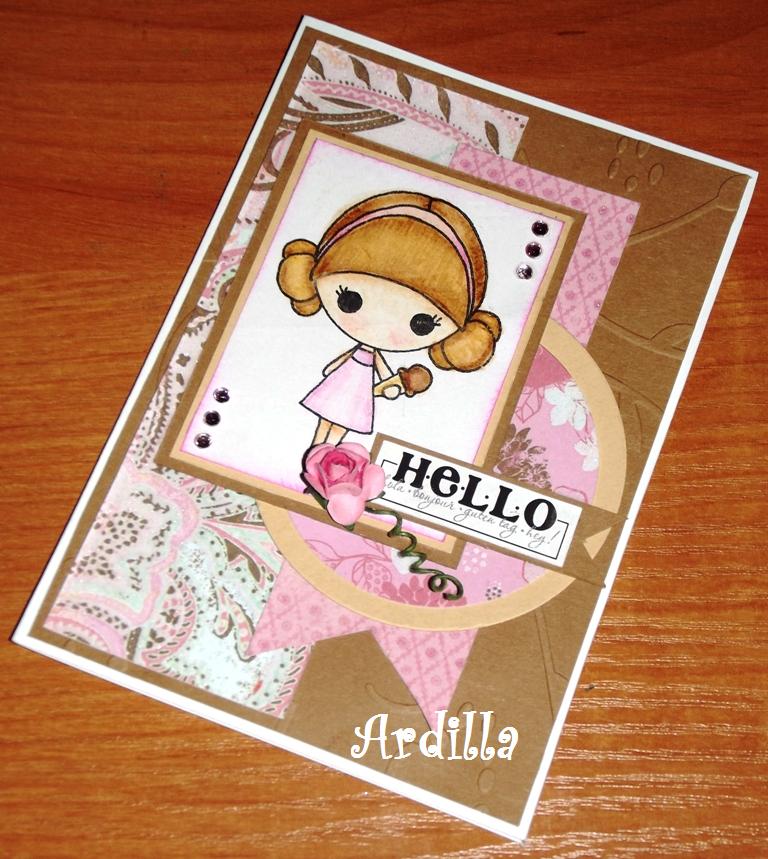 The dp is by Folia. The background is white cardstock and Vines with Hearts embossing folder (Sizzix). I used pink cardstock to mat different layers.