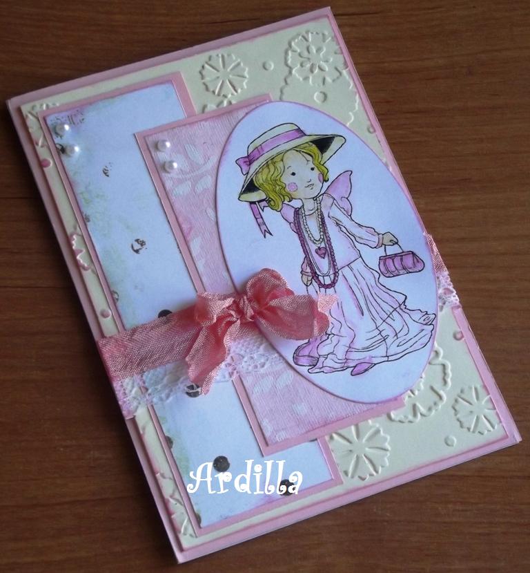 I looked in the huge collection of digis and found this cute little girl called Arelia to make my card (because she looks a little vintage to me). I colored it with Koh-i-noor aquarelable pencils and cut it with an oval die cut (Sizzix) and distressed the edge with a pink ink pad to give that old look to the image.