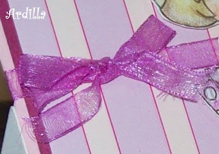 I used a Tiddly Inks image. I used ribbons to make a bow and some small embellishments with heart and circle shape.