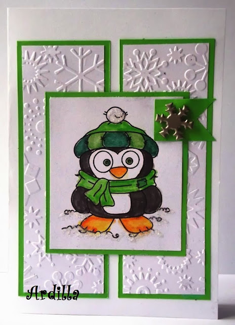 The cute image is by SKdigis, Chilly the penguin, and it was a freebie last month for the ones that linked cards on the FANtastic linking party, hopefuly next year will be back :) I colored it with Koh.i.noor aquarelable pencils. I placed it on a green cardstock mat and glittered the snow and the top of the hat.
